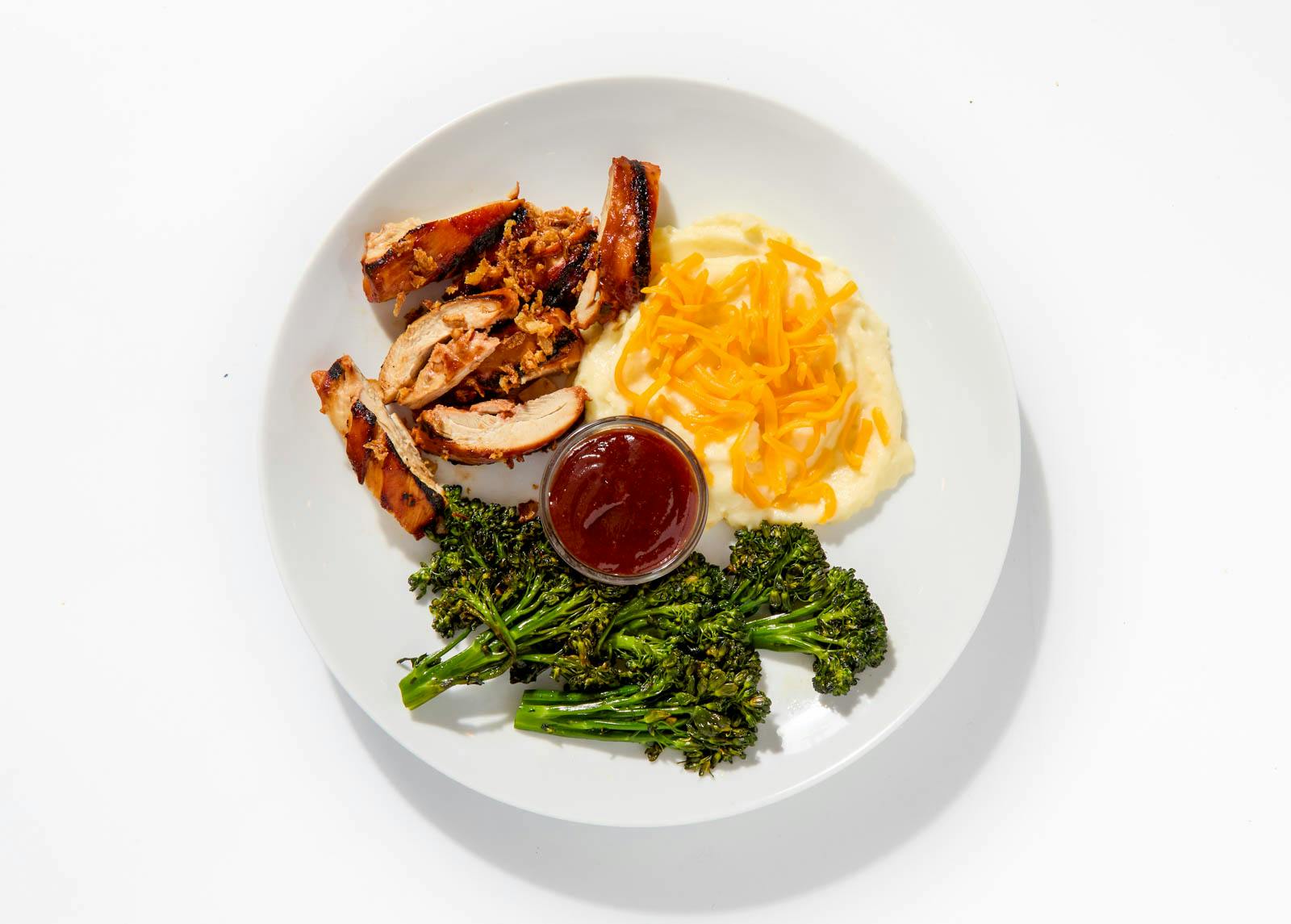 Savor our “Baked BBQ Chicken”, featuring with Charred Broccolini & Cheesy Mashed Potatoes. Created by Chef Esther Choi, it boasts an impressive 4.41-star rating and around 590 kcal per serving.. Please note it contains or may contain: Celery, Mustard, Wheat, Milk