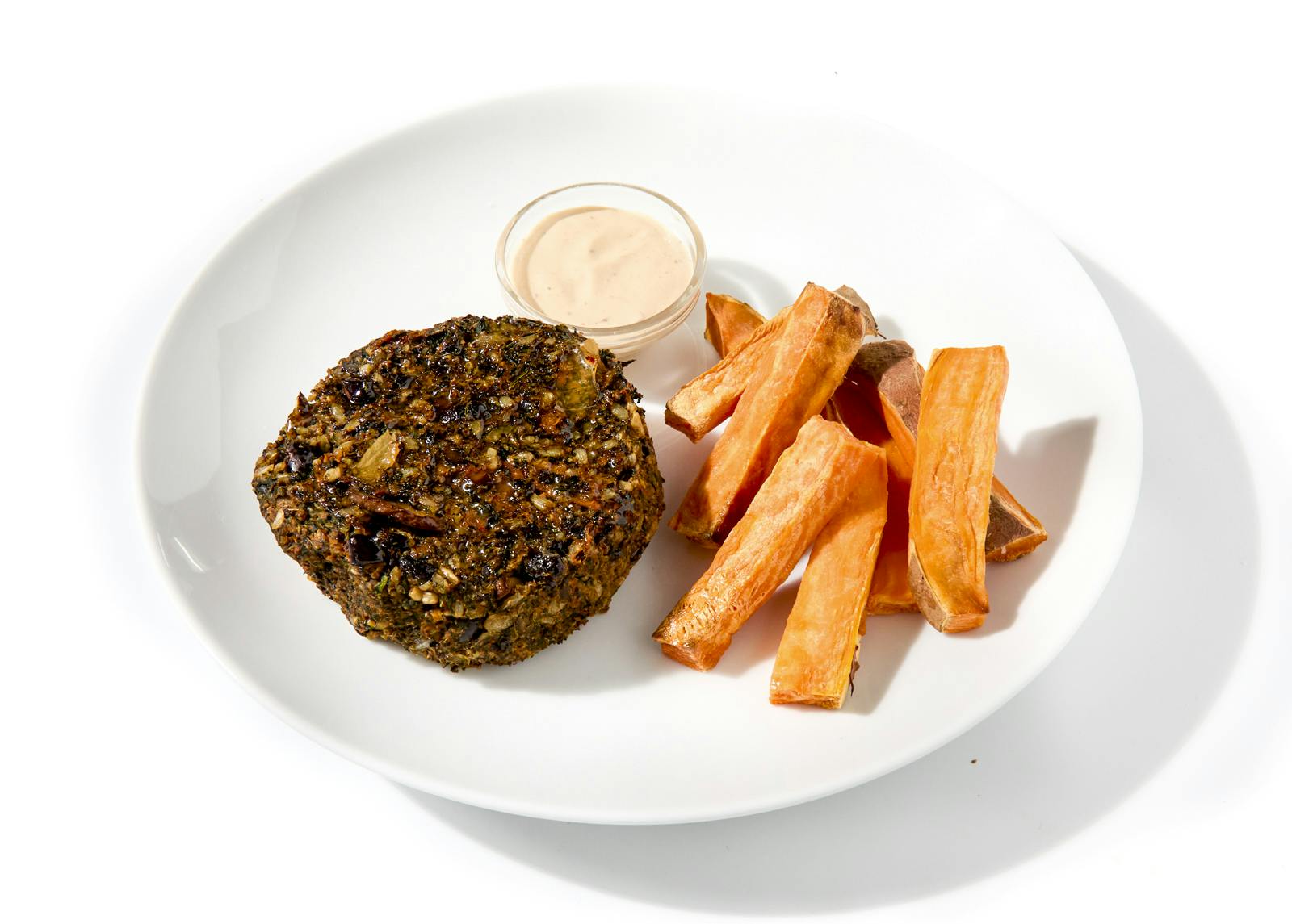 Savor our “Black Bean Burgers”, featuring With Sweet Potato Fries. Created by Chef Ivy Stark, and around 460 kcal per serving.. Please note it contains or may contain: Soybeans, Tree Nuts