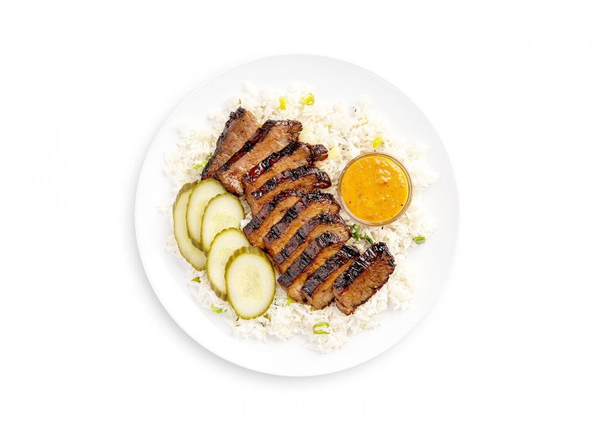 Savor our “Lemongrass-Marinated Flank Steak”, featuring with Peanut Sauce, Pickled Cucumbers & Scallion-Ginger Rice. Created by Chef Soulayphet Schwader, it boasts an impressive 4.48-star rating and around 770 kcal per serving.. Please note it contains or may contain: Molluscs, Peanuts, Fish, Wheat, Sulphur Dioxide and Sulphites
